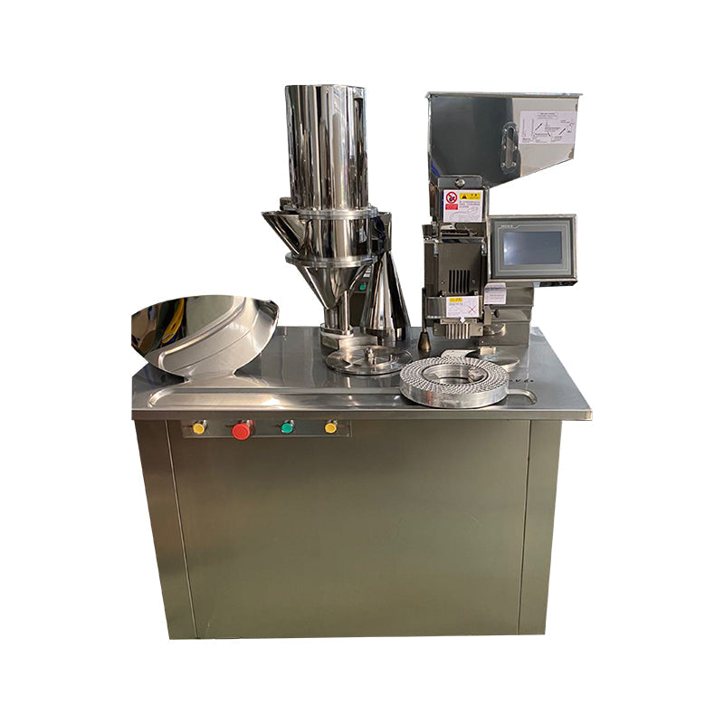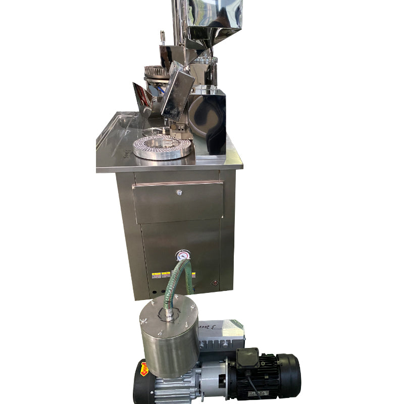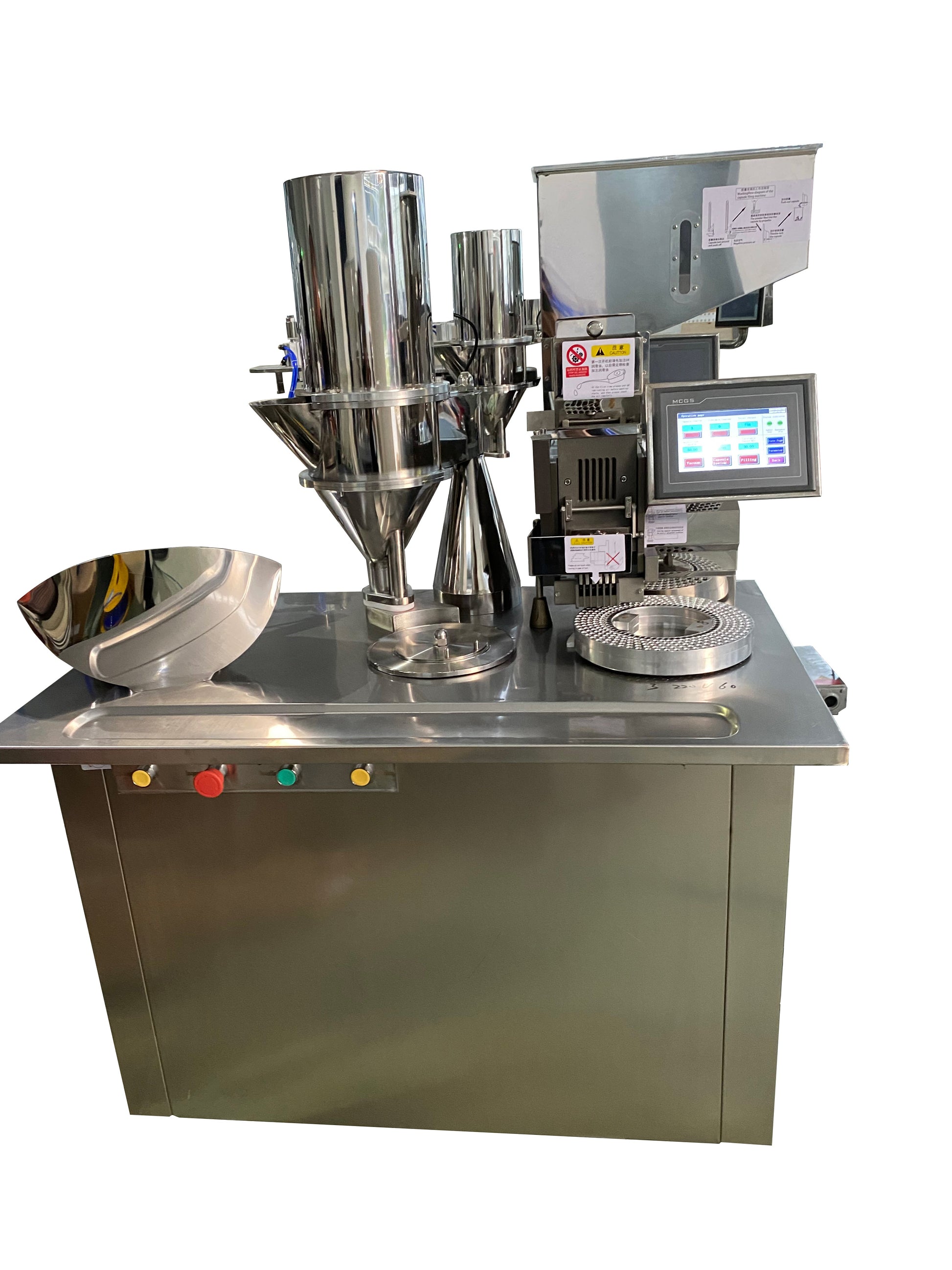 Estaciónes independientes de alimentación de cápsulas vacía, alimentación de polvo y cierre de cápsulas